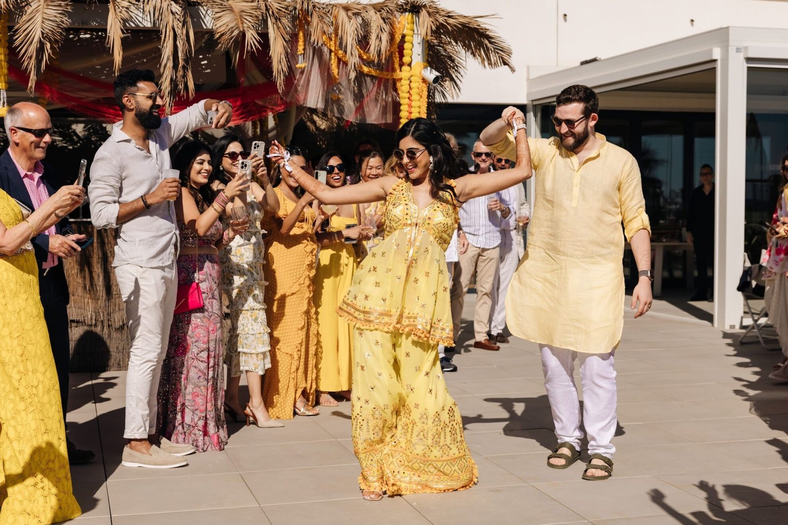 Within the late afternoon we transformed the hotel’s poolside right into a fiesta of color, music and traditional Spanish food, with various stations for guests to accessorise themselves with jewellery and henna art. This was where Chhaya and Harry’s Haldi ceremony took place, a Hindu tradition through which family and friends take turns applying turmeric paste to the bride and groom – a custom meant to grant the couple prosperity of their marriage, and ward off evil spirits.