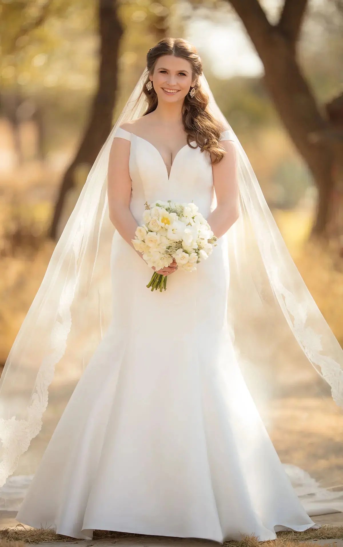 In relation to easy wedding dresses, the benefit of Essense of Australia Style D2477 is what makes it so glamorous and ideal for the classic bride. This gorgeous off-the-shoulder gown includes a plunging sweetheart neckline harking back to an old-Hollywood style. It makes its way effortlessly into off-the-shoulder sleeves, making a look that highlights the face beautifully.